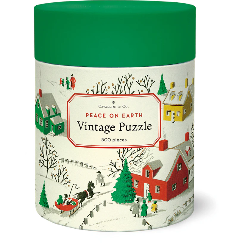 Celebrate the holiday season with this puzzle designed with vintage imagery from the Cavallini archives. A muslin drawstring bag and a miniature poster guide included.