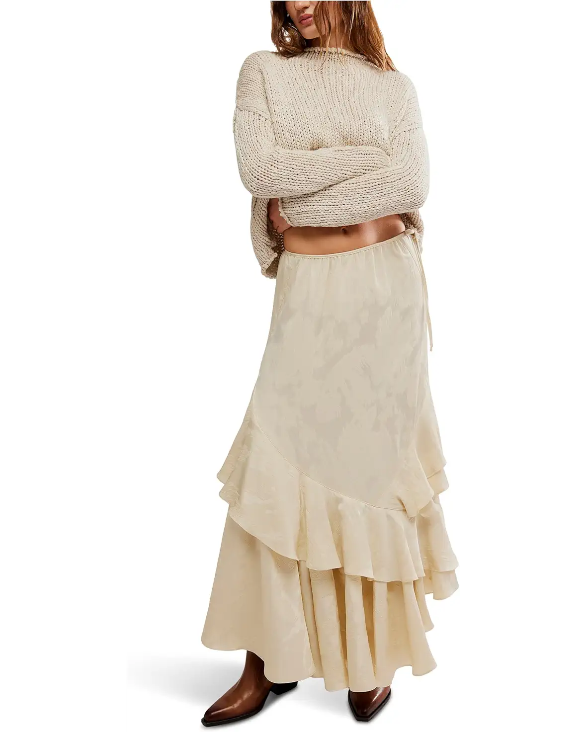So classic and forever femme, this sweet maxi skirt features a jacquard floral design throughout with asymmetrical ruffle hemline and tie detail at the side for a timeless touch.