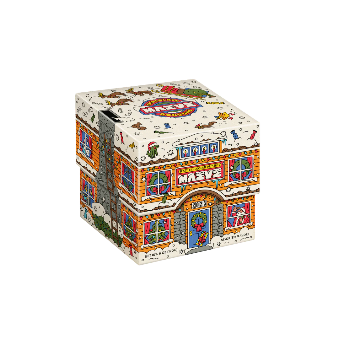 Santa’s just passing through, but he picked the right place to stop. With his sleigh parked on the roof and six flavors of milk and dark chocolate bonbons inside, this little bungalow could tempt him to linger. It’s a holiday chocolate gift box with curb appeal and serious snack potential.