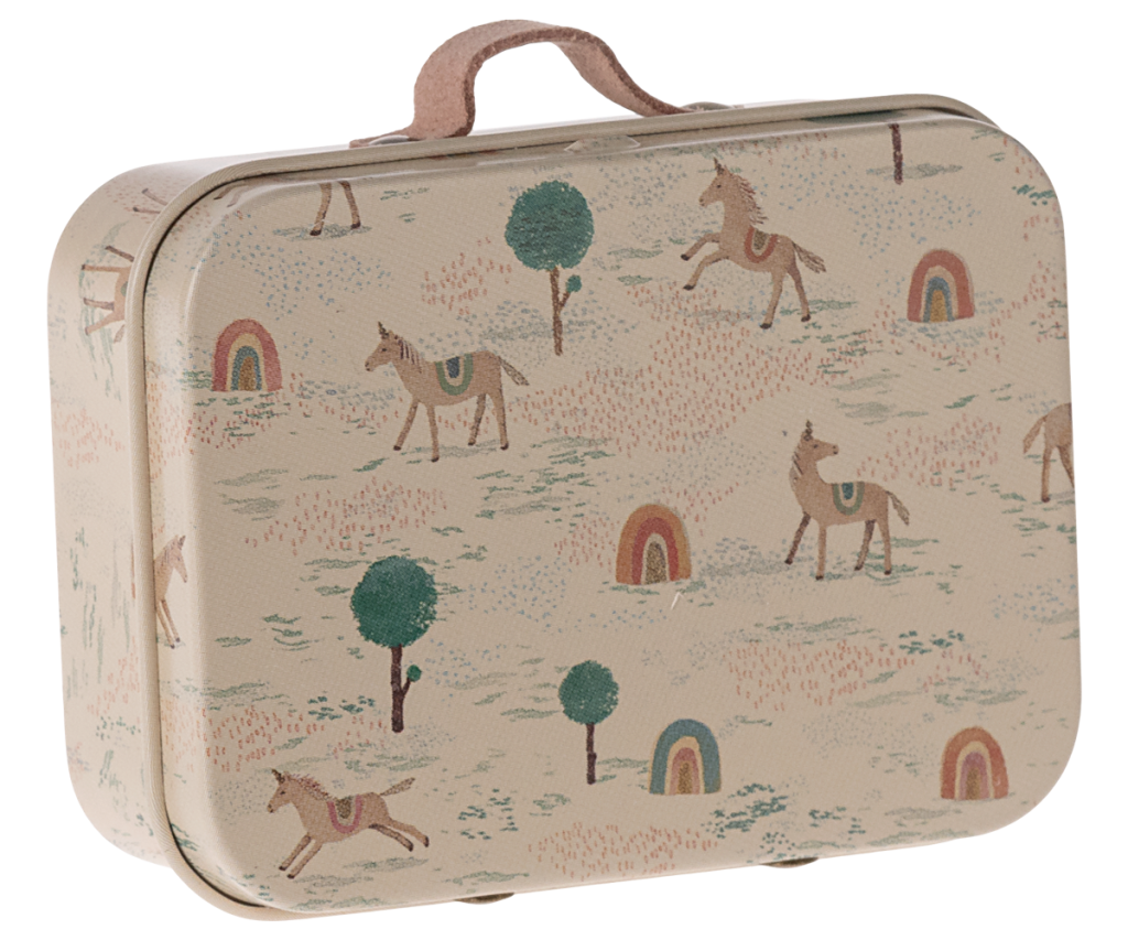 Maileg Micro Suitcase Des licornes This small metal suitcase with colourful illustrations and beautiful details can be used for any occasion: small gifts, storage of small items or for mice and small bunnies to bring their belongings on the go. Or even take hair accessories or little treats for little ones. travel storage perfection for those tiny things.