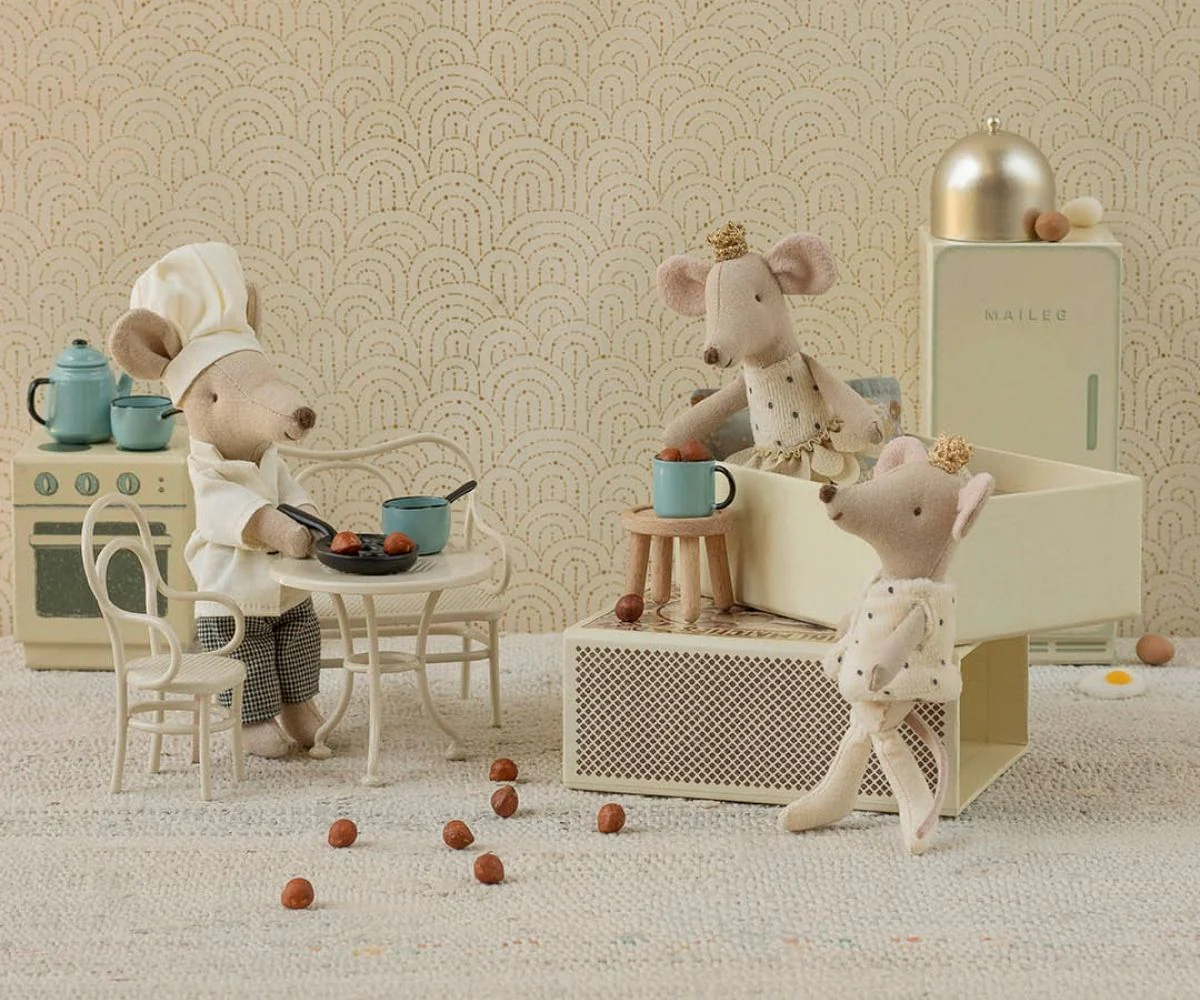A lovely playset with a chef mouse, soup pot, and spoon. Make dinner time a play with this sweet set. Match it up with Maileg's kitchen collection and miniature food for the story to continue.