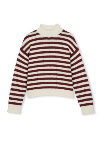 The Corrine is a staple sweater crafted in a cozy wool blend. It features a relaxed, boxy fit, ribbed details at the cuffs and hem, and pointelle stripes throughout.