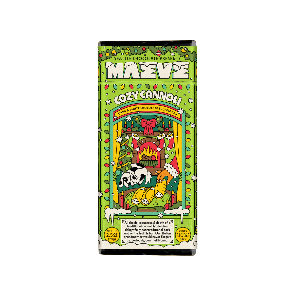 Dark chocolate with a white chocolate meltaway center, dotted with mini chocolate chips, crispy cannoli flakes, and a sprinkle of pistachios. All the flavor of the Italian bakery classic, with a little more sparkle and a lot more chocolate.