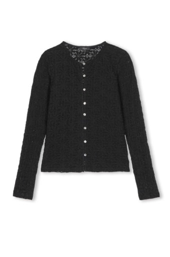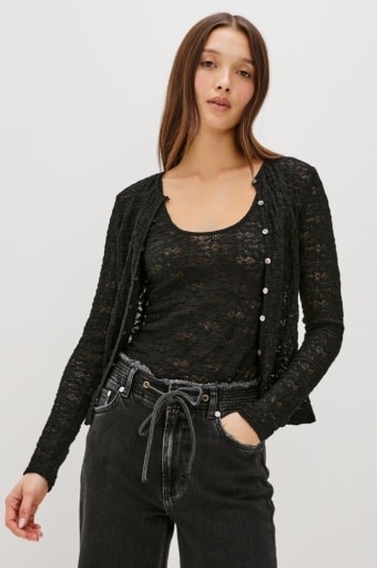 The Cyrah is a sheer, lightweight cardigan, showcasing delicate, feminine lace. It's designed with a fitted cut and a full button-front closure.