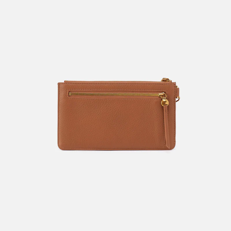 A zip top wristlet with a removable strap.