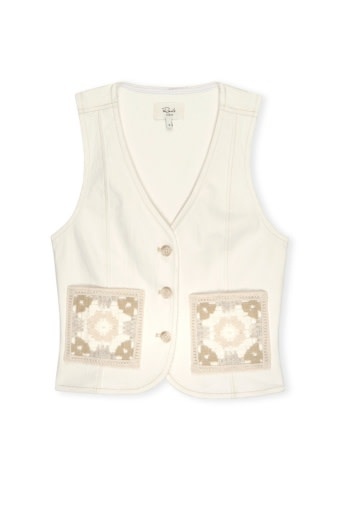 The La Jolla is a cropped denim vest featuring horn buttons and unique crochet patch pockets. Its cotton fabrication provides a flattering structure with just the right amount of subtle stretch.