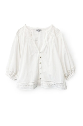 Made from lightweight beach cotton, the Lilah blouse features an airy fit, deep v-neckline, and three-quarter elasticated sleeves. Delicate eyelet details line the sleeves and hem.
