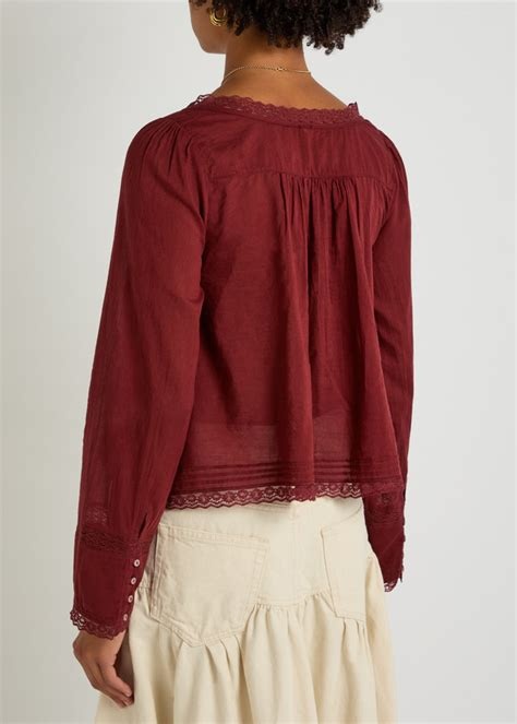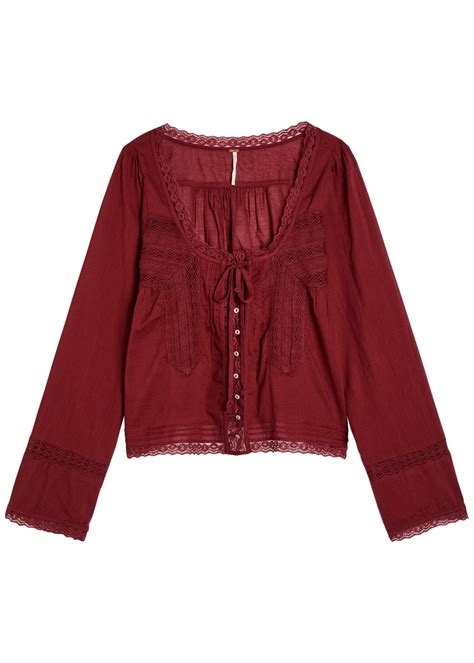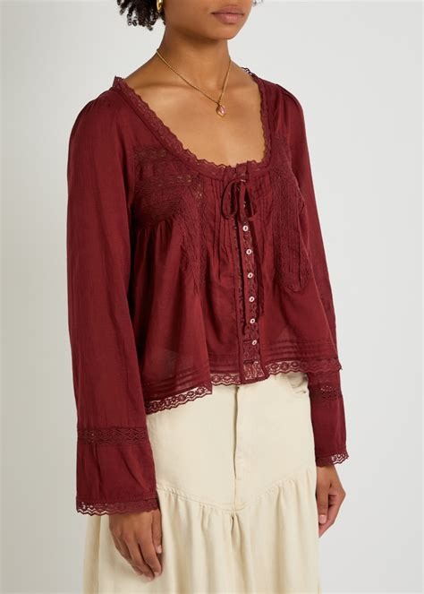 Fit: Relaxed fit, slightly croppedFeatures: Soft cotton fabrication, square-neckline with tie detail, button closures, long-sleeves with cuffs, sheer lace trimWhy We ❤ It: This lace-adorned top pairs perfectly with your favorite slouchy jeans or a sleek mini skirt.